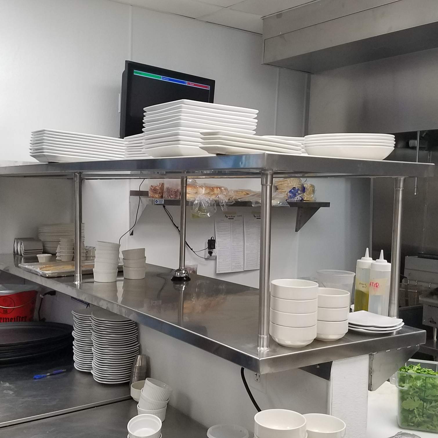Bear Metal Works custom designed and fabricated a 2-tier serving shelf for the kitchen at Apertivo restaurant on Transit Rd. This shelf was mounted on top of a stationary wall in the kitchen that separated the prep station and cooler units. This shelf was constructed of 16ga stainless steel with a mounting channel underneath to secure it from leaning over the wall. Underneath the top shelf (not shown) are heat lamps for the kitchen to use and keep plates warm before serving to customers.