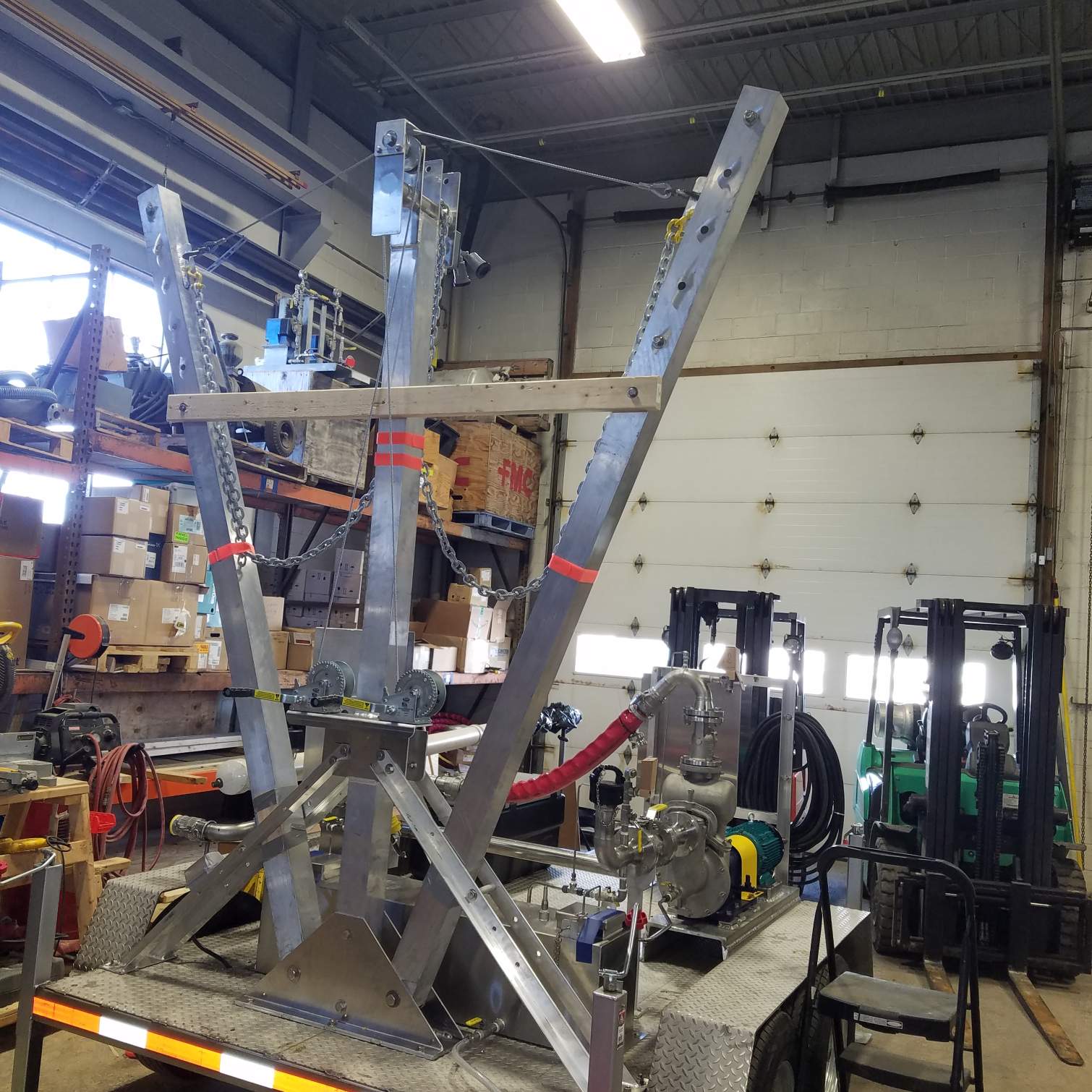 This aluminum boom was fabricated to custom fit a trailer for a local chemical manufacturer. This configuration helps load and pour chemicals on a jobsite for companies around the world. The arms are used as pully's and can adjust according to the height and weight needed.