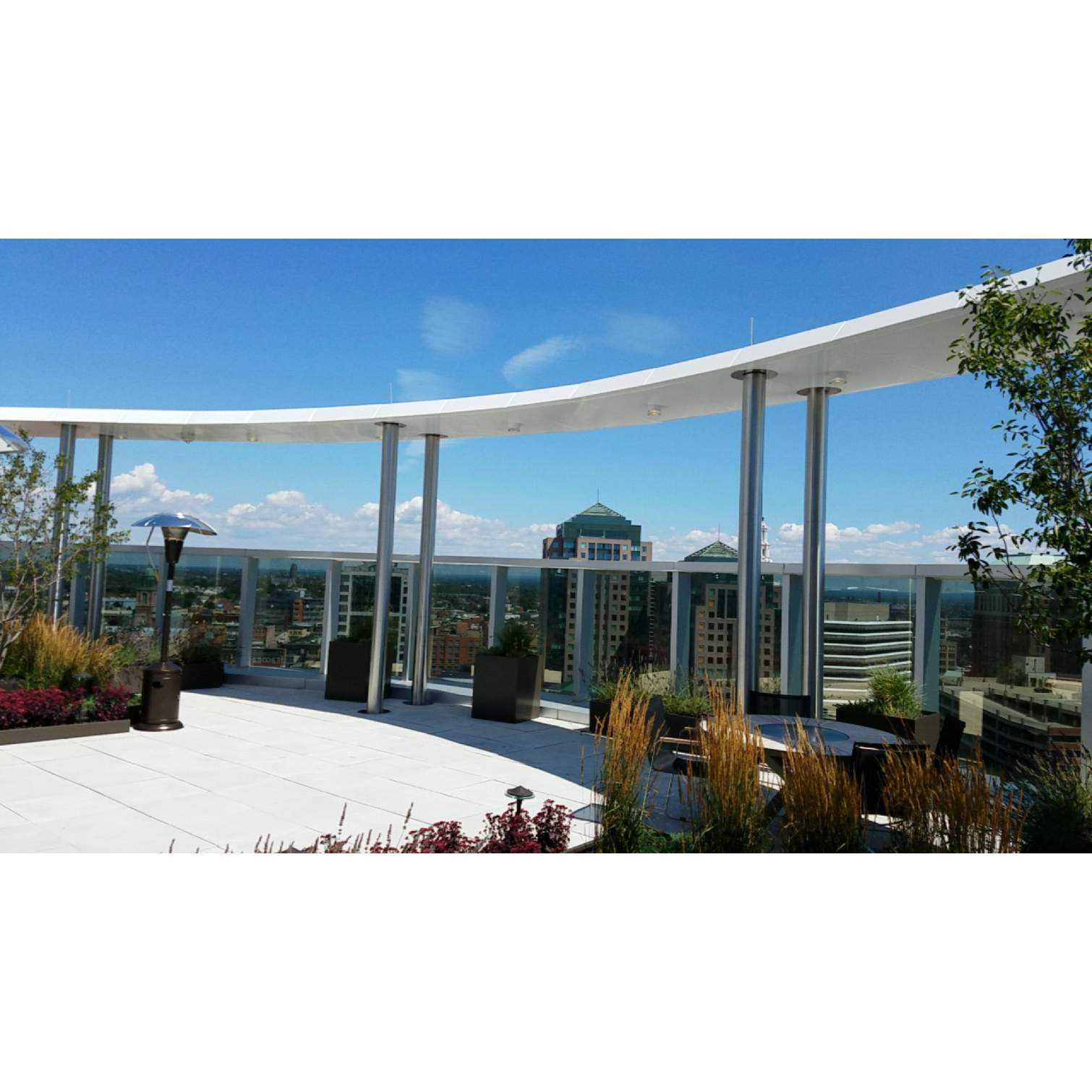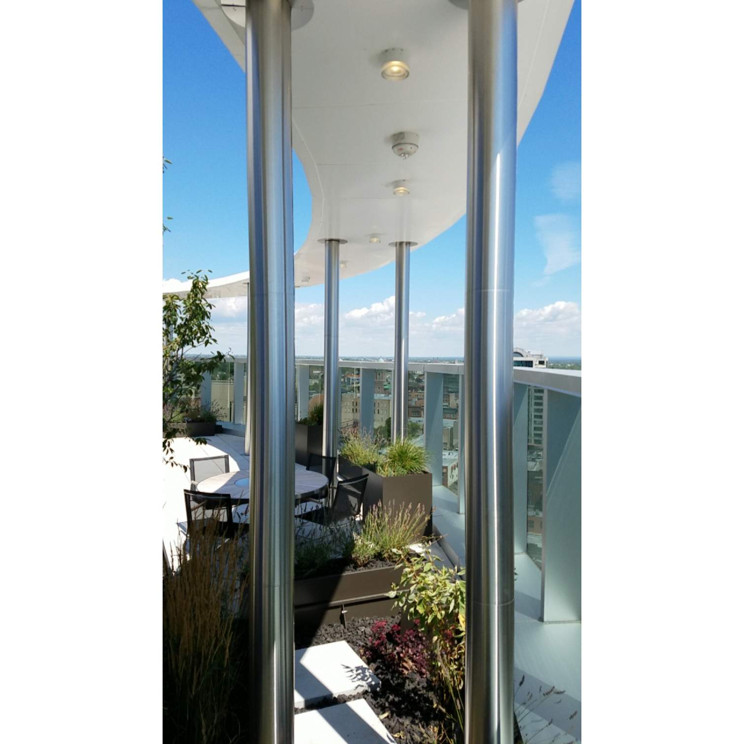On the 12th floor of the new 250 Delaware building recently completed by Uniland, lies an executive terrace with breath taking views. Denler Stainless was asked to wrap these fiberglass columns that were previously white, with stainless steel. This gives the terrace a whole new modern look and really fits with the overall genre of the building. These columns are 12 feet tall and sit on top of a heated concrete paved patio. Bear Den Services came in to install each of these columns, which took (3) four foot pieces of 20ga stainless steel wrapped around the column and then riveted to the original fiberglass. All joints were made as tight as possible so there is very little visibility of seams. After each column was wrapped and secured to the floor and roof, we fabricated custom rings to go around the top and bottom of the column to give it that more modern look and cover any blemishes left by the previous header.