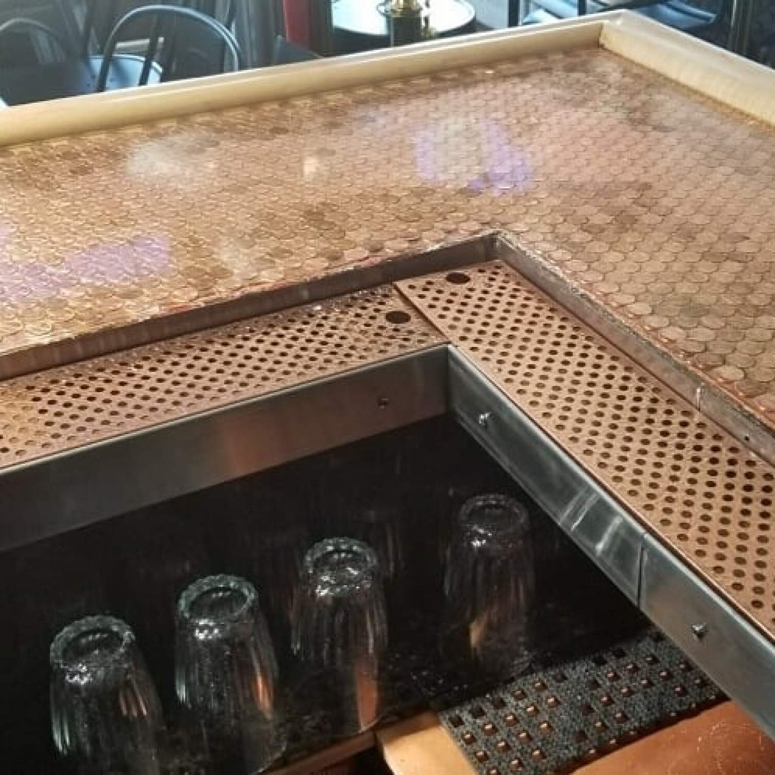 Bear Metal Works is the one stop shop for drink rails! Check out this custom stainless steel drink rail with copper risers we made for Savoy bar on Elmwood in Buffalo. This drink rail really makes this bar stand out and the copper matches the penny top great!