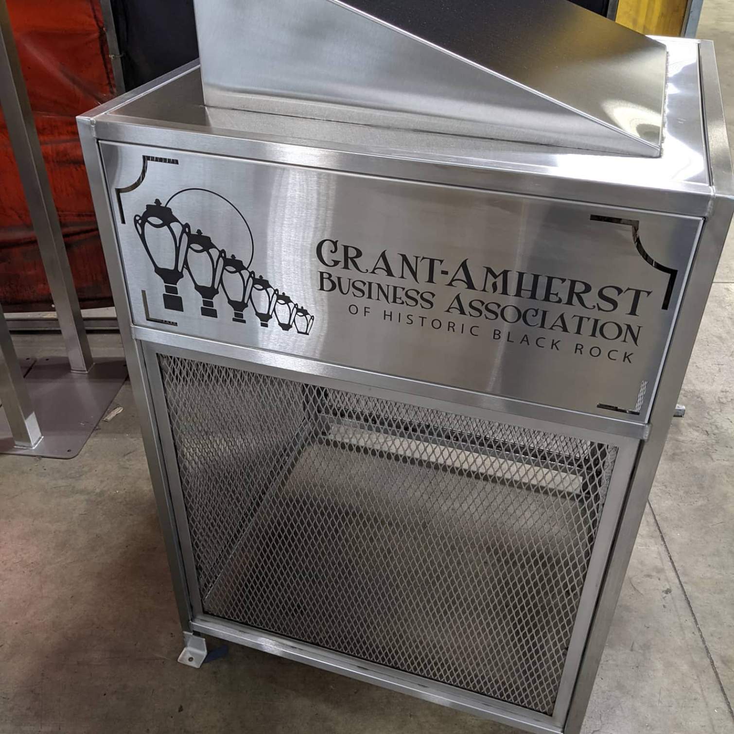Bear Metal Works teamed up with the Grant Amherst Business Association to develop these custom garbage can holders down the popular North Buffalo neighborhood. This project was a year in the making and is apart of the Association/City's plan to redevelop and improve the streetscape. These garbage can holders were custom designed and made of all stainless steel to never rust and really shine! The logo was laser engraved and we put a magnet/latch so the door does not swing open. We also fabricated the new signage stands that go on each corner in the neighborhood and each tell a different story about the historic buildings in the area.