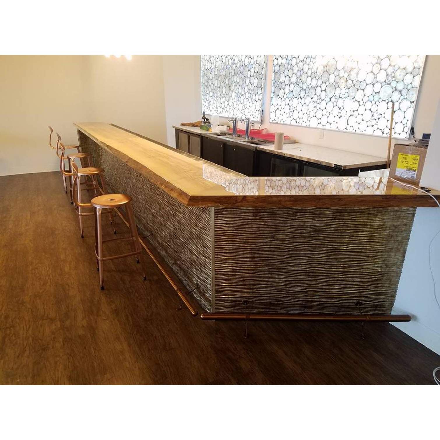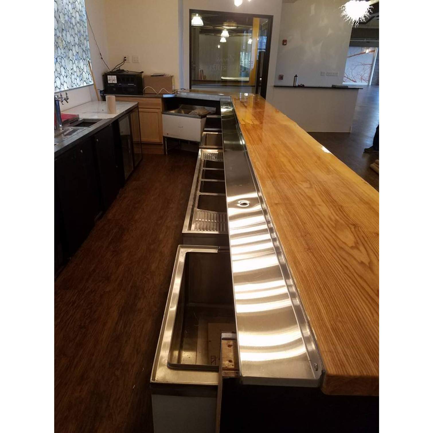 Bear Metal Works had the pleasure of fabricating and installing a custom stainless steel drink rail with welded corners, drain spots and drip edge. This drink rail was over 12 feet long and custom fit to the customers wooden bar top. We also made a shelf for the back bar and table for glasses/drink ware underneath. The highlight of the project was the copper foot rail we installed that really makes the bar stand out. This space in North Tonawanda will be open coming at the end of this year for weddings, parties and any other large events. This building has so much history, we're happy to be apart of the revitalization!