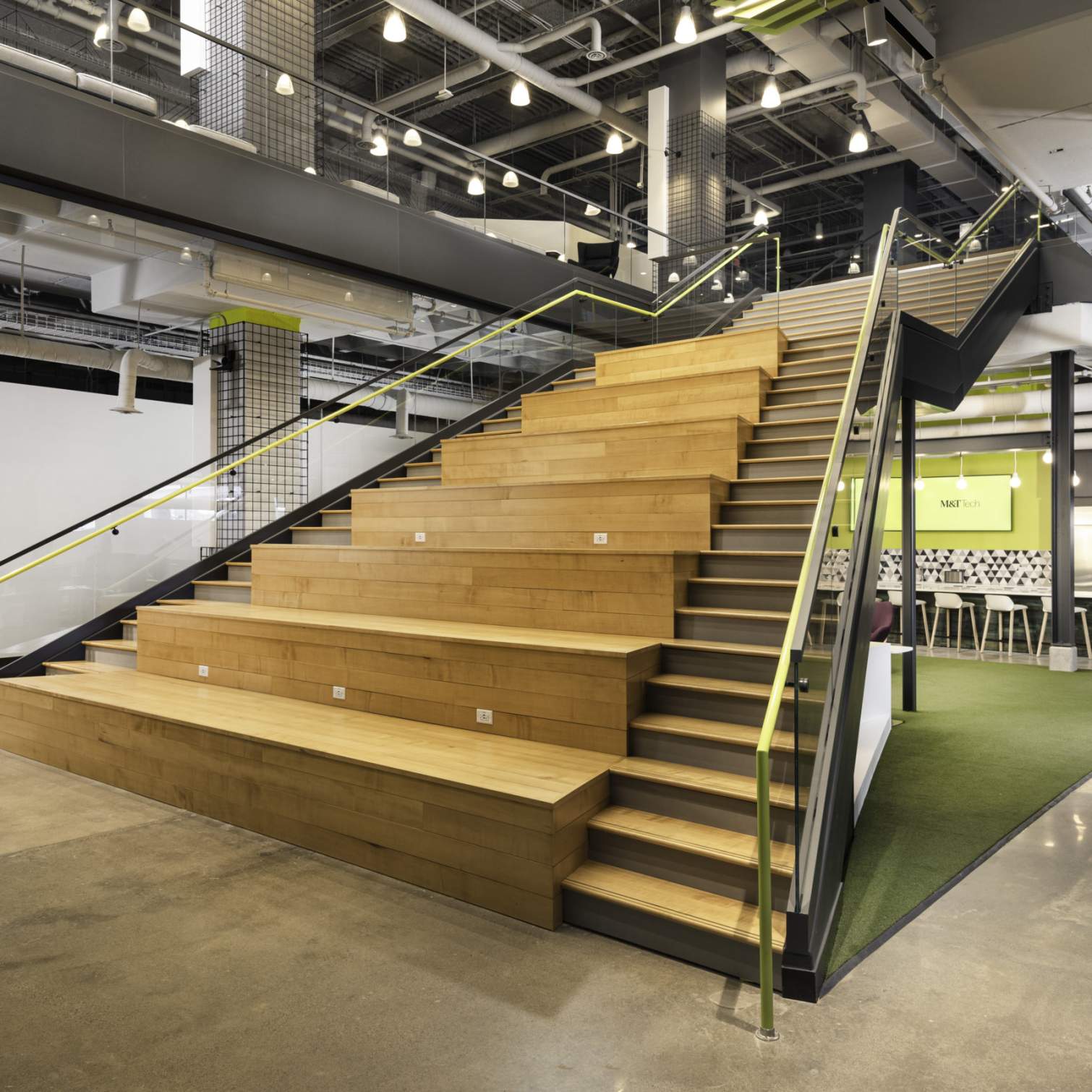 Bear Metal Works had its hands in one of the coolest and most anticipated building renovations in Buffalo in recent memory. Our friends at Hogan Glass came to us to do the aluminum railings at the M&T Tech Hub at Seneca One Tower. This was made of 1.5'' round aluminum tubing and was welded at precise angles then painted a bright neon green to match the banks color scheme. What a cool project and what an amazing building!