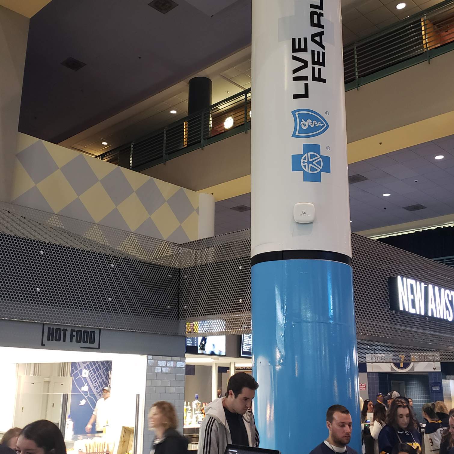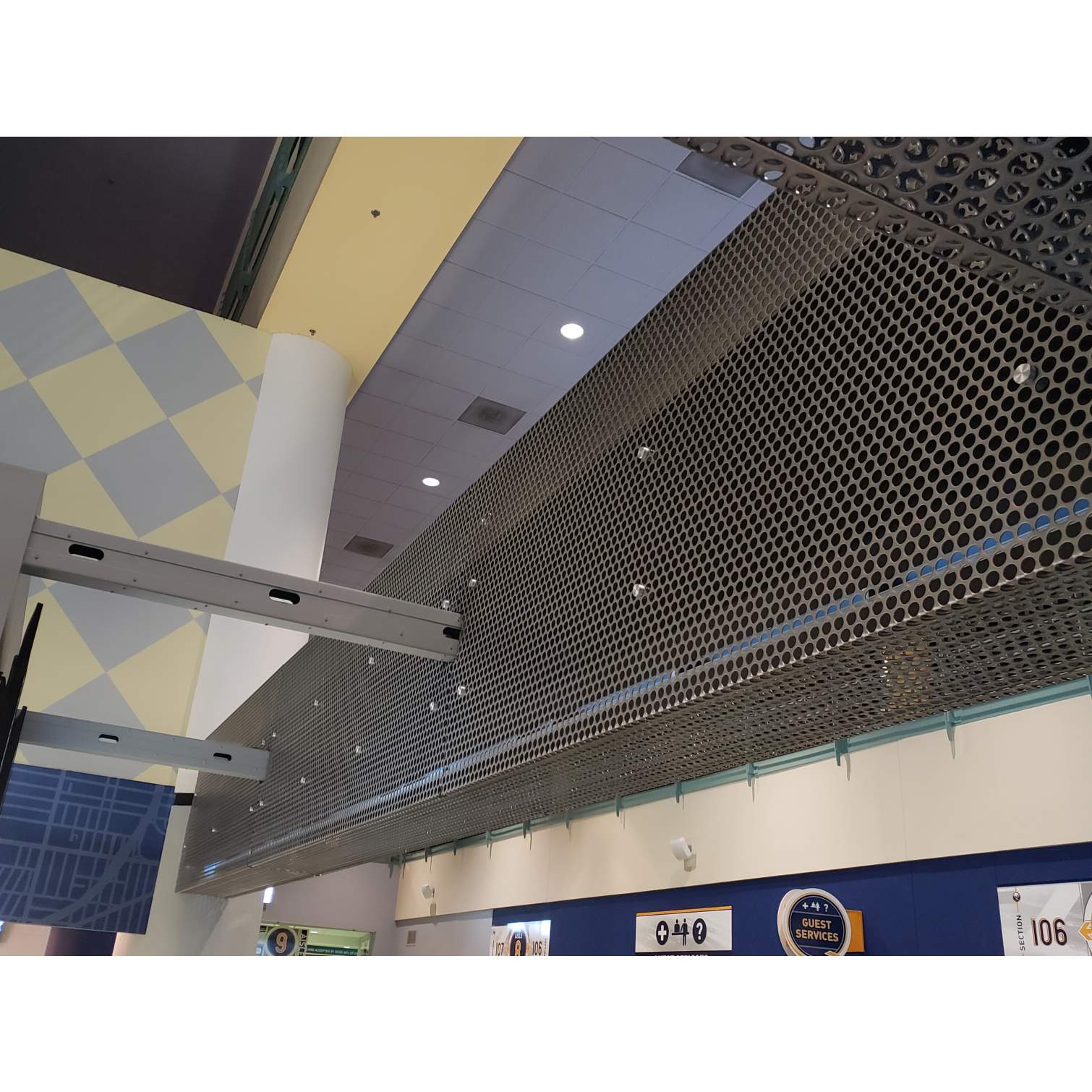 The renovated concessions on the main concourse level at the Keybank Center in Buffalo got a nice stainless steel touch to them! The New Amsterdam Bar and The Market on Perry are new additions to the arena and Bear Metal custom fabricated some perforated beam covers to give the concessions a textured look while covering up the beams behind the signage. This job required multiple design meetings and precise measurements to form around each one of the beam covers while having all the perforated holes line up and look uniform. We think it came out awesome! Be sure to check it out at the next Sabres game you're at!