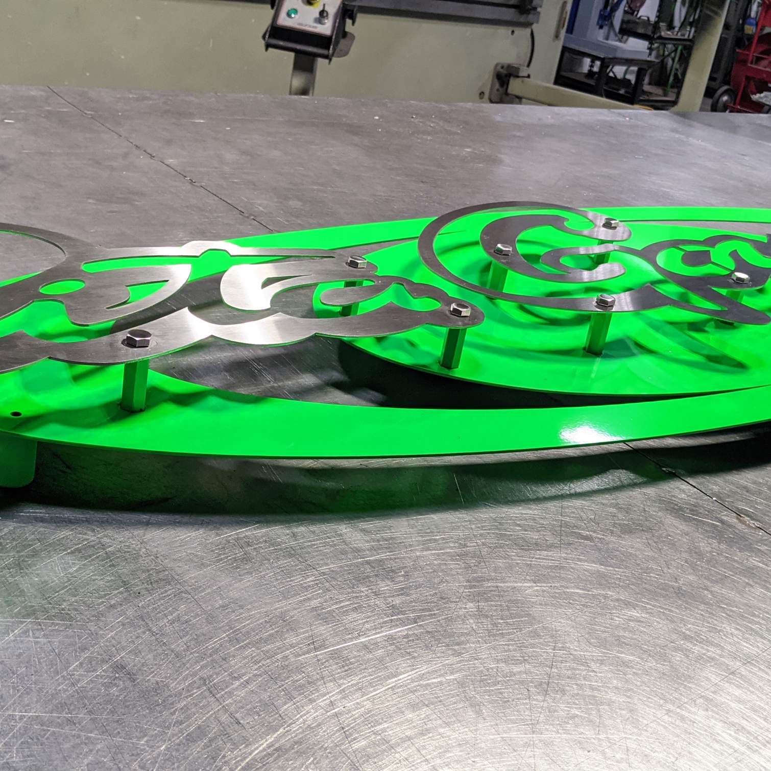 Check out this custom sign we recently finished for the new Pita Gourmet restaurant in Orchard Park. We welded stand offs on the back so lights can be mounted and then custom color powder coated to match the logo. We then bolted the stainless steel logo for easy removal and mounting.