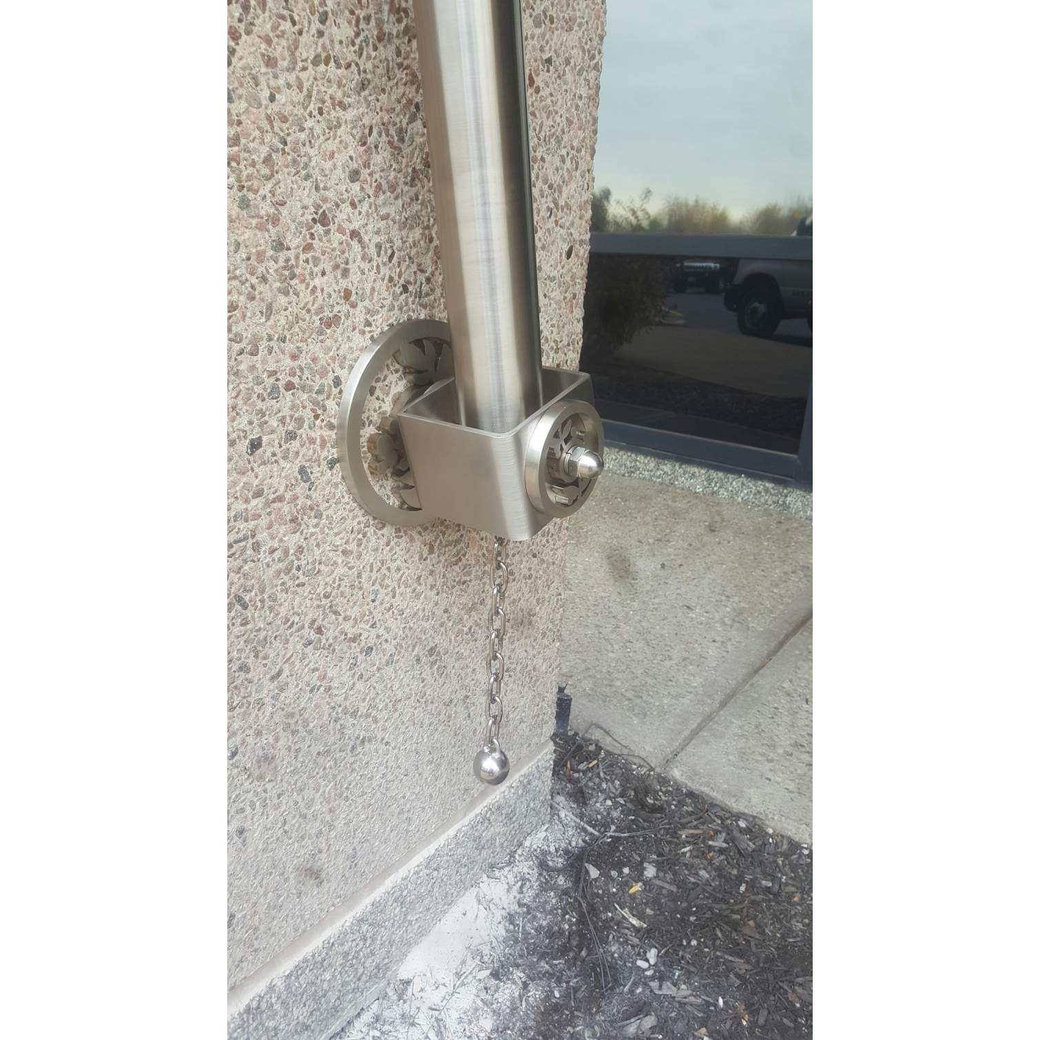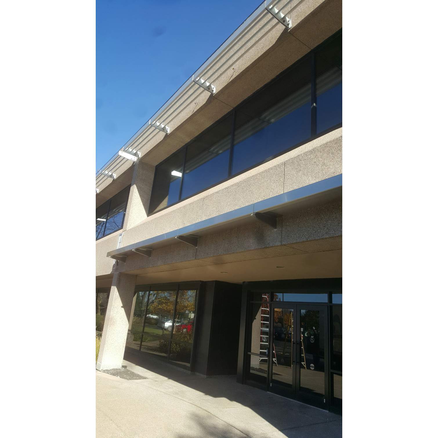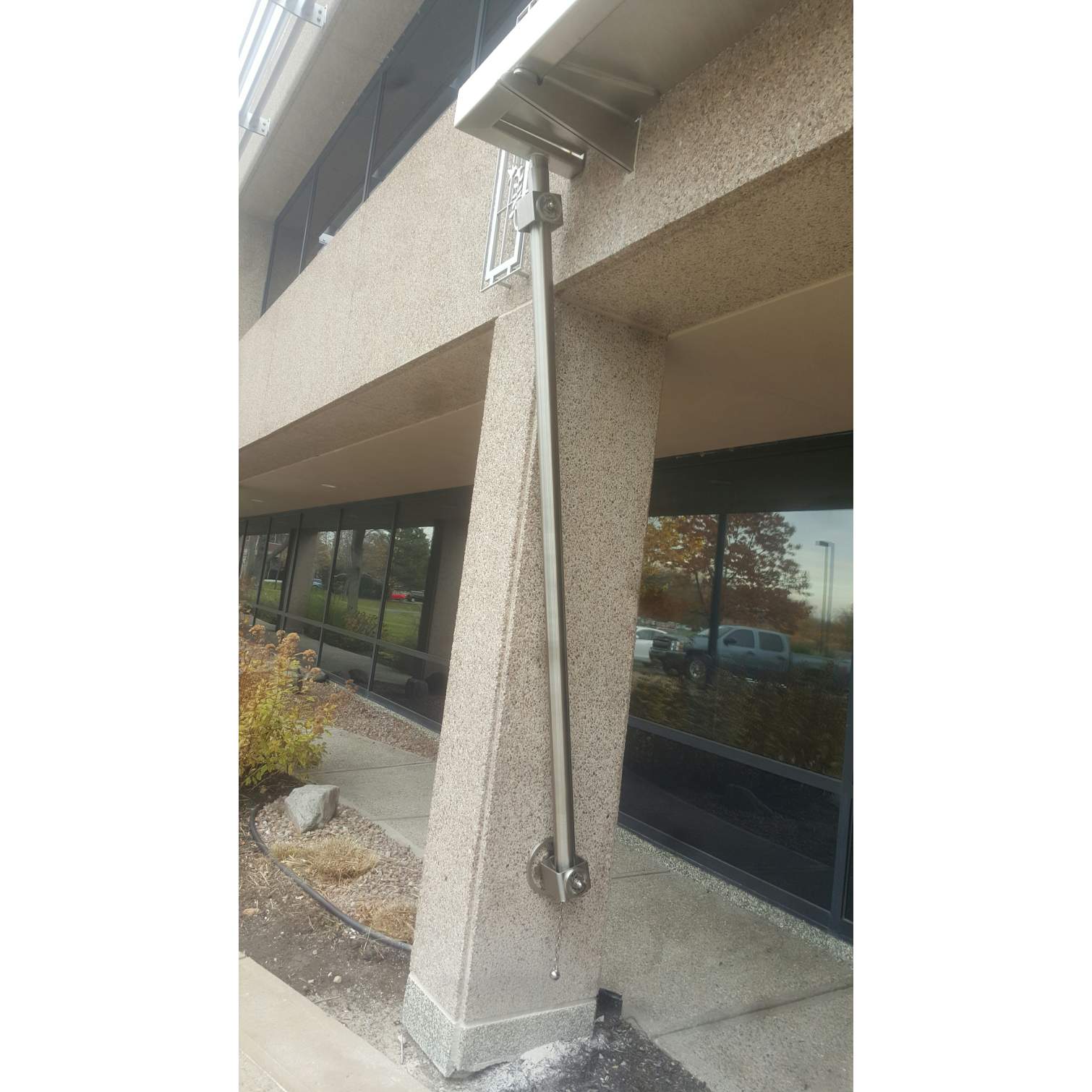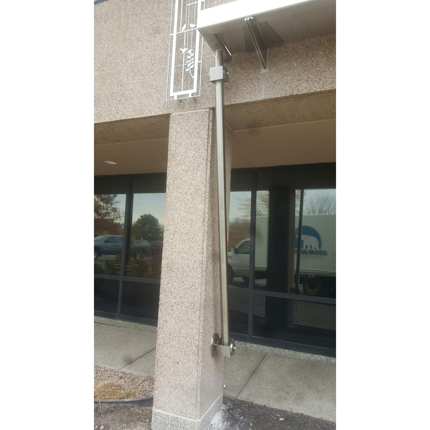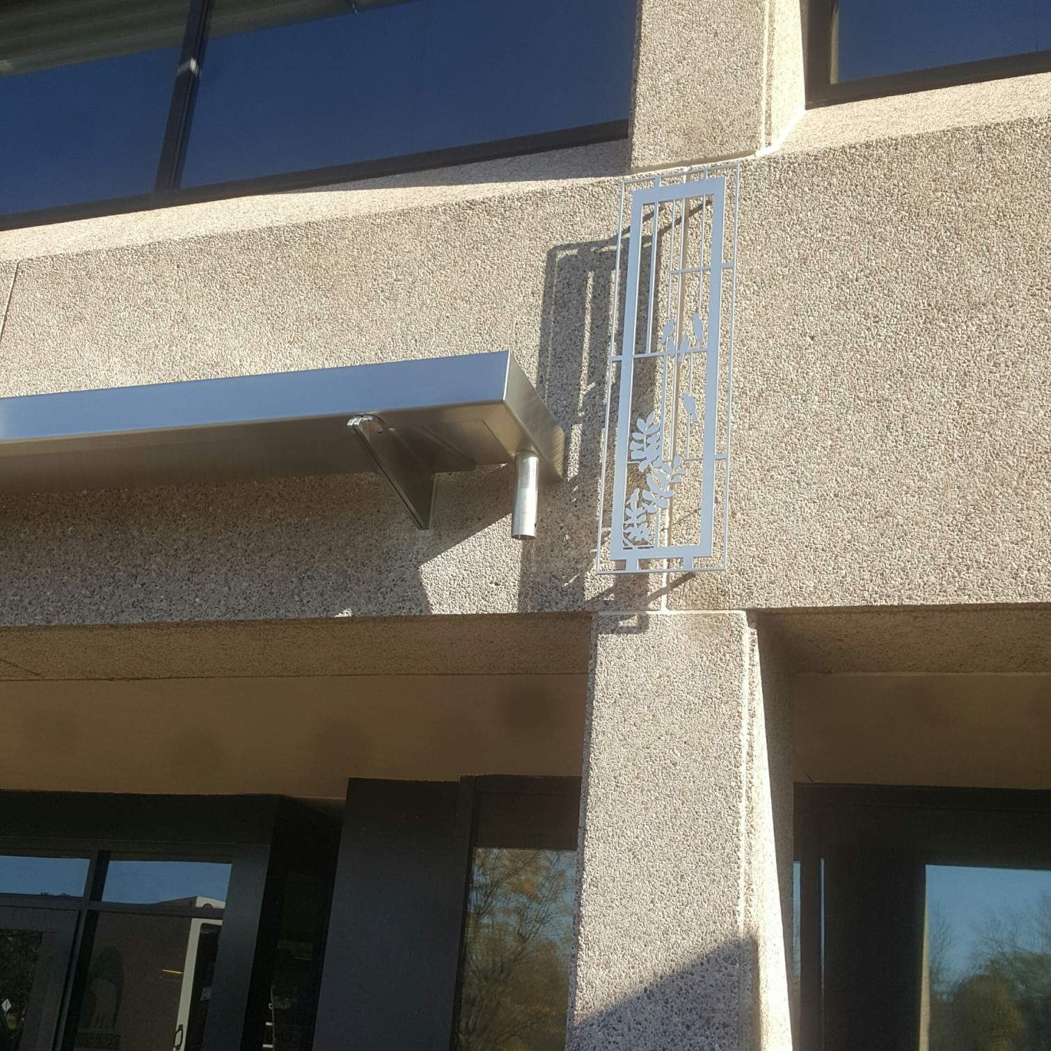 This custom fabricated stainless steel canopy we did for Iskalo Development in Amherst was a very unique job of ours. We laser cut all parts to size, formed, welded and then polished them up. This canopy will never rust and hold up to any conditions it is put through due to the high grade of stainless steel we use. Also fabricated were the "decorative bird frames" on each side of the canopy and along the building. These frames are backlit with LED lights for night time. The stainless gutters and downspouts were also fabricated per customer ideas and came out great. The "bird" theme went along on the top and bottom of the gutters as we laser cut a special and unique design for them. A decorative ball and chain was attached to the bottom of the downspout to give these gutters the final touch it needed. These were anchored to the concrete columns of the building and are secure in place to withold any issues.