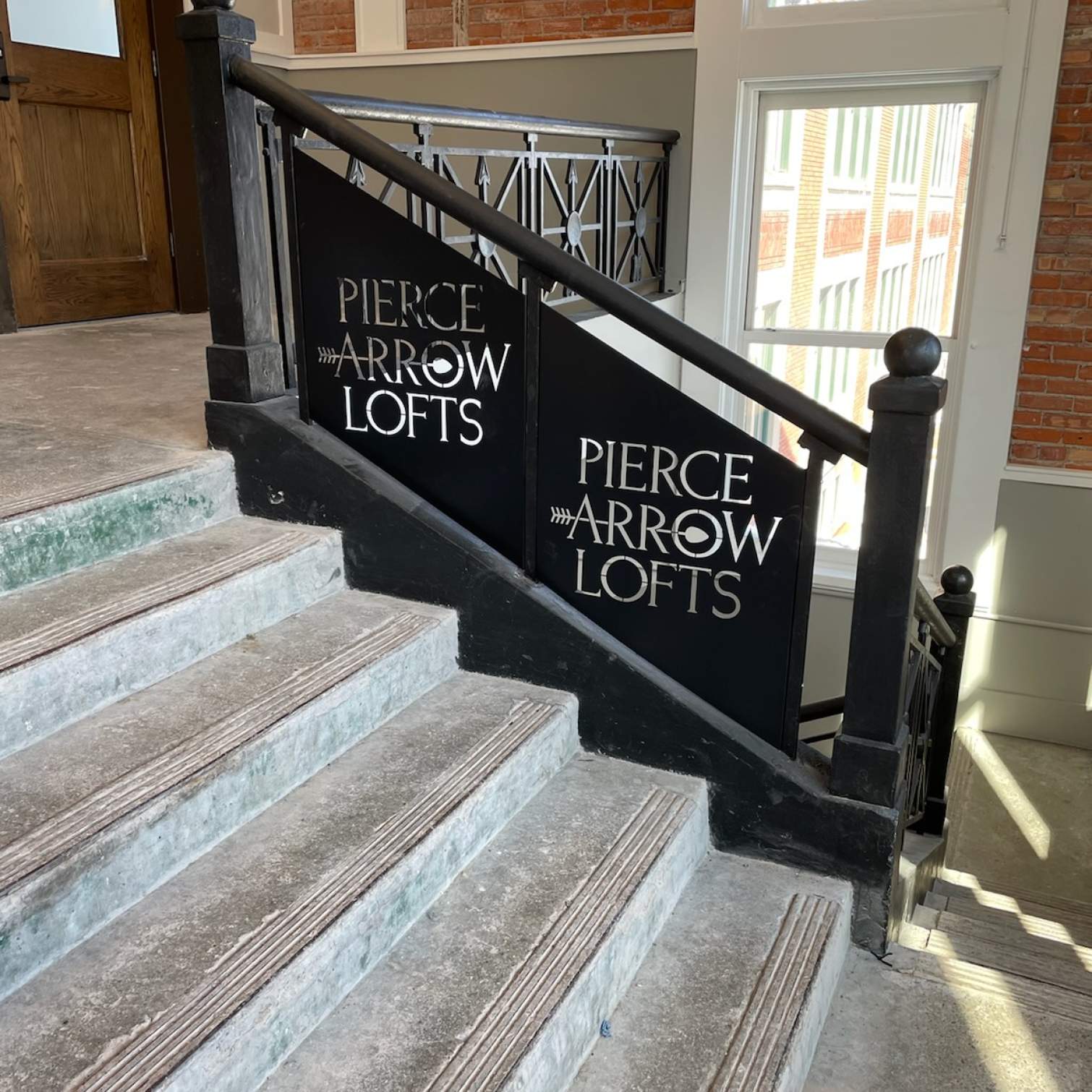 Our Customer at the Pierce Arrow Loft building requested we made these laser cut panels with the building logo throughout the stairwells along with wall panels at the entry way. These were then powder coated satin black.